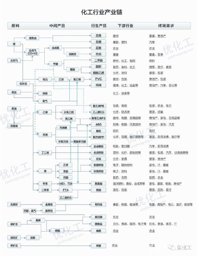 從化工產業鏈分析其情況。基礎化工大的方向可以從三段論來分析:上游原材料、中間產品和下游情況。上游原材料簡單概括就是原油、煤礦和各種化學礦(鋰礦、鉀礦和磷礦)。下游,可用衣食住行四個字來概括。所有化工子行業都可以落實到這四個字。衣:紡織行業,與紡織行業有關的化學用品,以及紡織行業用的纖維、滌綸等。食:化學類食品加工行業、農化板塊、氮磷鉀、復合肥、農藥、食品添加劑和醫藥等。住:房地產、與房地產相關的比如家電類等。行:汽車、高鐵、輪胎里的橡膠子行業等。