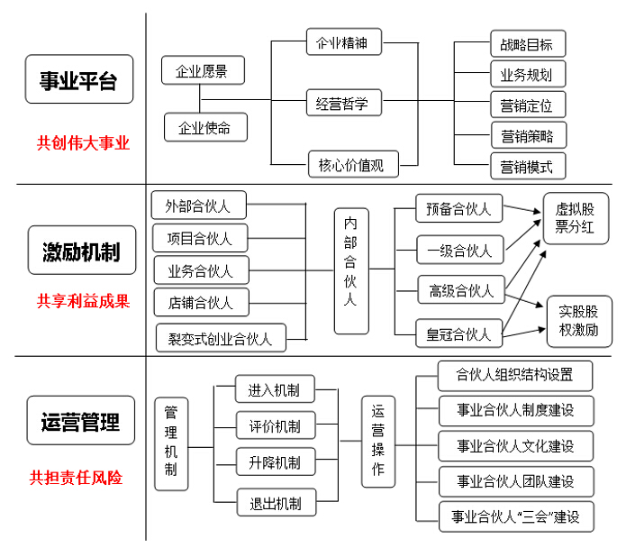因此,企業要引入事業合伙制,首先要回歸企業的頂層設計,回歸企業的使命追求與核心價值觀、回歸企業的事業理論,它需要企業家與合伙人對上述命題進一步完成系統思考并達成共識,對推行事業合伙制的目的與目標要真正想明白、想清楚、想透。沒有對事業追求的系統思考和共識,事業合伙制充其量只是一種力度更大的利益分享機制,到頭來聚集的還是一支雇傭軍,只為錢而戰,而不是為使命與事業而奮斗。企業家為什么要推行事業合伙制?要達到什么樣的目標?沒有真正想明白、想清楚、想透,就容易對推進方案反復、遲疑,不斷翻燒餅,甚至在關鍵時刻不講信用、不兌現承諾。